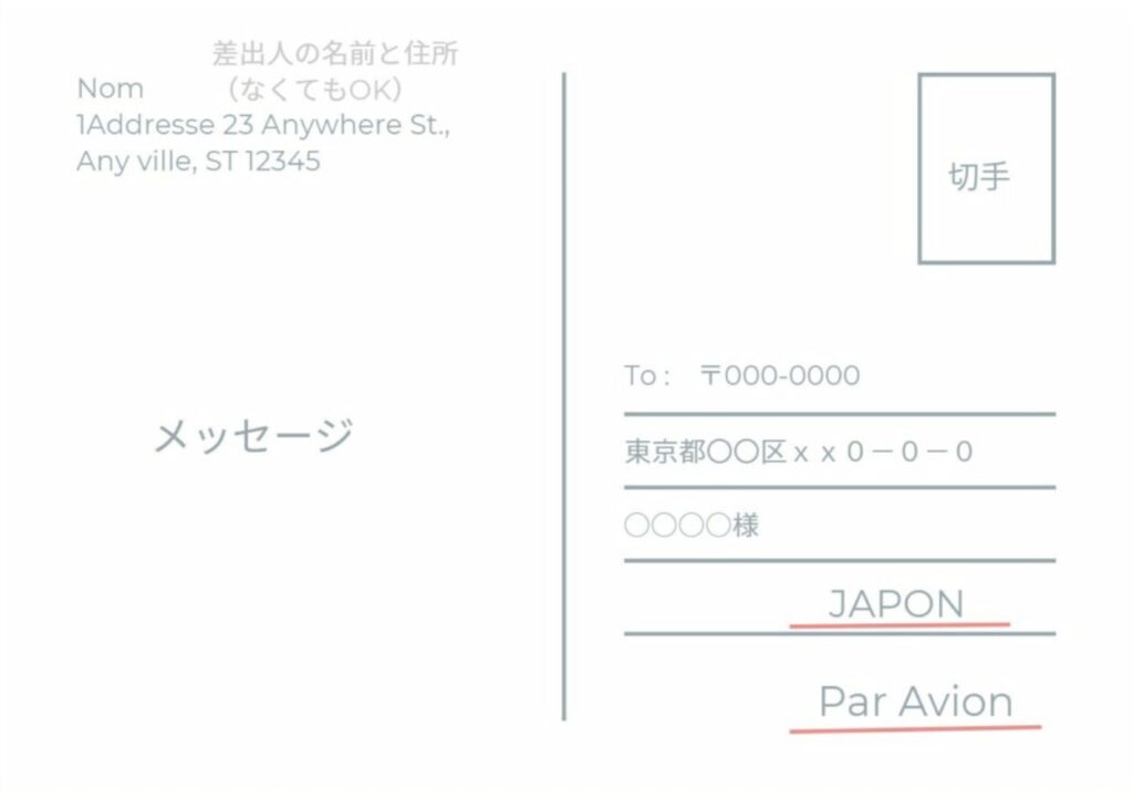 ポストカードの**右下に「Par Avion」と「JAPON」**と書くだけでOKです。